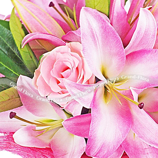 (на фото): лилия розовая (возможна замена на белую) - 2 шт., роза розовая - 3 шт., натуральная упаковка - розовая.