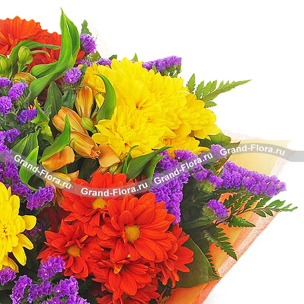 Стандартный: хризантема желтая кустовая - 2 шт., хризантема кустовая оранжевая - 2 шт., альстромерия оранжевая - 2 шт., статица - 4 шт., фетр желто - оранжевый, ваза.