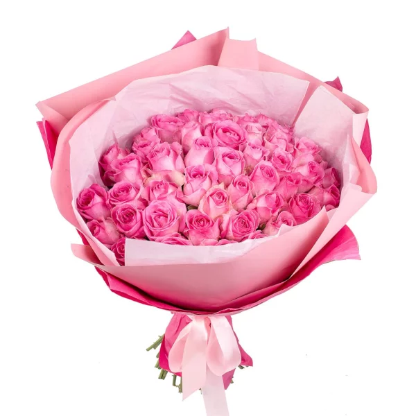 роза розовая - 25 шт., упаковка, лента. Оттенок роз может отличаться от представленного на фото