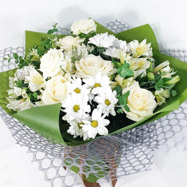 ЛЮКС: роза белая - 9 шт., эустома белая - 5 шт., альстромерия белая - 9 шт., хризантема кустовая белая - 7 шт., фетр зеленый.